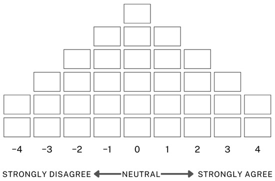 Researchers can implement Q sorting in various formats, including forced distribution or free sorting. In particular, forced distribution requires participants to rank each statement in relation to others rather than evaluating them in isolation, thereby revealing a coherent internal meaning system. This study employed a forced distribution method using a quasi-normal distribution, as illustrated in Figure 1. We instructed participants to sort the 39 Q sample statements across a nine-point scale, assigning a fixed number of items to each level of agreement or disagreement [42].