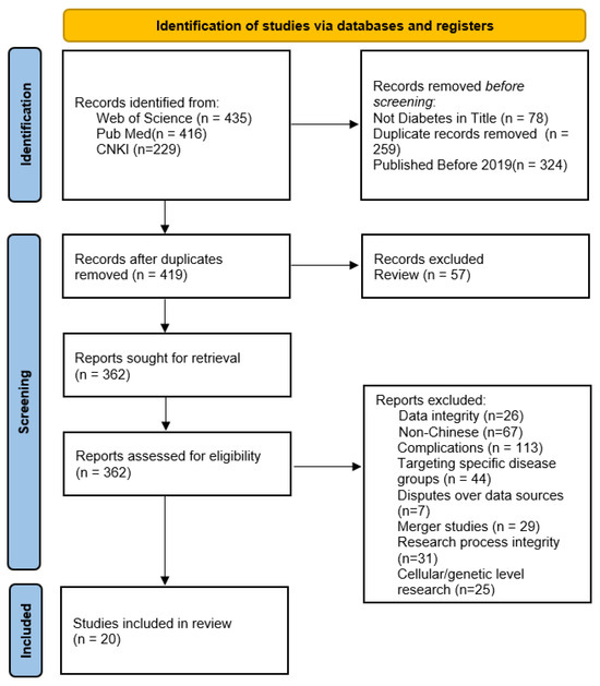 After screening the titles and abstracts, 362 documents proceeded to the full-text assessment phase. According to the pre-defined exclusion criteria in Methods Section 2.2, we reviewed each of these full texts and finally excluded 342 studies. The exclusion categories and corresponding reasons are shown in Supplementary File S1.