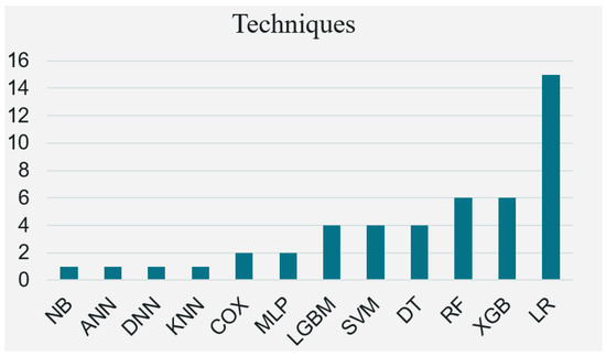 Overall, 14 techniques were extracted from the SLR. As can be seen from the results in Figure 3, machine learning (ML) was the preferred choice, with only a few researchers exploring mathematical and deep learning (DL) approaches. Overall, 18 of the studies (90.0%, 18/20) chose ML to construct prediction models for diabetes progression, while 2 articles (10.0%, 2/20) considered mathematics, and 3 papers used DL (15.0%, 3/20). Figure 3 shows the 12 most commonly used models in the field of diabetes progression prediction. The most commonly used method was logistic regression (LR) (75.0%, 15/20). This is followed by Extreme Gradient Boosting (XGB) (30.0%, 6/20) and Random Forest (RF) (30.0%, 6/20), then Decision Trees (DT), Support Vector Machines (SVM), and Light Gradient Boosting Machines (LGBM), which have almost equal distributions (20.0%, 4/20), and then Multilayer Perceptron (MLP) and Cox Proportional Risk (COX), which are also almost equally distributed (10.0%, 2/20). These are followed by Artificial Neural Networks (ANN), K-Nearest Neighbor Algorithm (KNN), Deep Neural Networks (DNN) and Naive Bayes (NB), which are also almost equally distributed (5.0%, 1/20). Table 3 is a fully enriched comparison table used for all twelve modeling methods, with detailed strengths and weaknesses and classic supporting references for each: