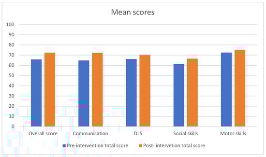 Mean scores pre- and post-EAI in the VABS-II by domain and subdomain.
