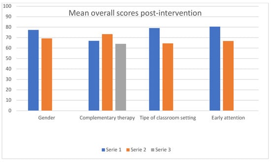 As can be observed in Table 3, the children in a standard classroom setting had higher scores in the VABS-II compared to those in an open classroom setting; this is a significant finding that is supported by the overall score averages post-intervention (standard-classroom: 79.09 ± 12.21 ~ open-classroom: 64.50 ± 11.37; t(17): 2.64, p = 0.017), as well as by the average increases in score averages post-intervention (standard-classroom: 10.64 ± 11.49 ~ open-classroom: 2.63 ± 2.61; t(11.392): 2.23, p = 0.046). Similarly one can observe higher scores also in children that receive early attention compared to those who do not; this observation is verified both by the post-intervention overall score averages (YES-ATT: 80.43 ± 15.98 ~ NO-ATT: 66.75 ± 10.98; t(17): 2.21, p = 0.041) and by the post-intervention average increases in the scores (YES-ATT: 13.43 ± 12.43 ~ NO-ATT: 1.83 ± 2.29; t(6.238): 2.44, p = 0.049). However, no statistically significant differences can be observed with respect to the gender variable either in the post-intervention overall score averages (boys: 73.33 ± 18.13 ~ girls: 69.25 ± 4.49; t(17): 0.43, p = 0.667) or in the post-intervention increases (boys: 7.27 ± 9.47 ~ girls: 4.25 ± 2.50; t(17): 0.61, p = 0.544). Moreover, the results do not show statistically significant differences in post-intervention overall scores (p = 0.849) or in the post-intervention average increases (p = 0.280) with respect to the age of the children. Similarly, the complementary therapy variable also does not yield statistically significant results, as the post-intervention overall score averages are higher in the group that received psychological support, followed by the group that did not undergo any type of therapy, and finally by those who received speech therapy (None: 66.89 ± 10.84 ~ Psych: 73.25 ± 8.95 ~ Speech: 64 ± 12.97; t(18): 0.27, p = 0.762). As to the average increase in the scores post-intervention, the greatest increase can be observed in the group of children that did not receive any type of complementary therapy, followed by those who received psychological support, and finally those who participated in speech therapy sessions (None: 8 ± 12.09 ~ Psych: 7 ± 3.16 ~ Speech: 4.33 ± 3.32; t(18): 0.31, p = 0.736) (Figure 2).