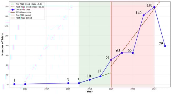 To validate the observed temporal patterns, we conducted statistical analyses comparing pre-2020 (2017–2019) and post-2020 (2020–2024) periods. The mean annual trial registrations increased dramatically from 10.0 trials per year pre-2020 to 96.4 trials per year post-2020, representing a 9.6-fold increase. This difference was statistically significant (Mann–Whitney U test: p = 0.018; independent t-test: p = 0.028) with a large effect size (Cohen’s d = 2.10). Temporal distribution analysis revealed a significant departure from random distribution patterns (χ2 = 464.2, p < 0.001), with 94.1% of all trials (561/596) registered in the post-2020 period despite representing only 42% of the study timeframe. Structural break analysis confirmed 2020 as a significant inflection point, with the annual registration slope increasing from 7.0 trials/year (2017–2019) to 29.3 trials/year (2020–2024), representing a 4.2-fold acceleration in registration velocity (both slopes p < 0.05) (Figure 1).