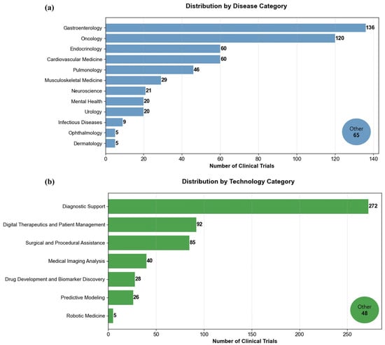 Distribution by disease and technology categories. Note. Horizontal bar chart showing the number of artificial intelligence clinical trials across (a) 12 primary disease categories or (b) technology applications.