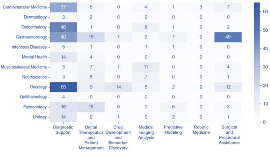 The disease-technology association matrix illustrates the distribution of trials across various disease and technology categories. Oncology demonstrated the highest activity in diagnostic support with 65 trials. This was closely followed by Gastroenterology, which showed significant engagement in surgical and procedural support (49 trials) and also in diagnostic support (40 trials). Endocrinology likewise had a substantial number of trials in diagnostic support, totaling 46, with Cardiovascular Medicine also showing a strong presence in this category with 37 trials. Regarding drug development, Oncology again led with 14 trials, marking the highest contribution in this area. In digital therapeutics and patient management, Pulmonology showed considerable activity with 18 trials, while also having 16 trials in diagnostic support. For diagnostic support, Mental Health and Urology each registered 14 trials, whereas Neuroscience had 3 trials. Further examining drug development, beyond Oncology, Gastroenterology contributed seven trials, and Musculoskeletal Medicine, along with Urology, each had one trial. In the domain of medical imaging, Musculoskeletal Medicine was particularly active with 11 trials, followed by Endocrinology with 8 trials, and Neuroscience with 7 trials. Overall, Dermatology, Ophthalmology, and Infectious Diseases remained the least represented across most technology categories (Figure 3).