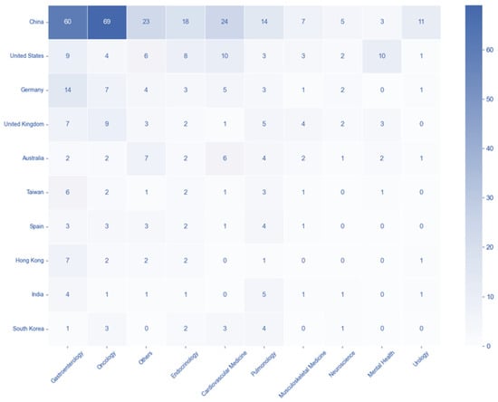 Geographic distribution of AI clinical trials across disease categories. Note. Heatmap displaying the intersection of countries (y-axis) and disease categories (x-axis). Color intensity represents the number of AI-related clinical trials, with darker blue indicating higher trial concentrations.