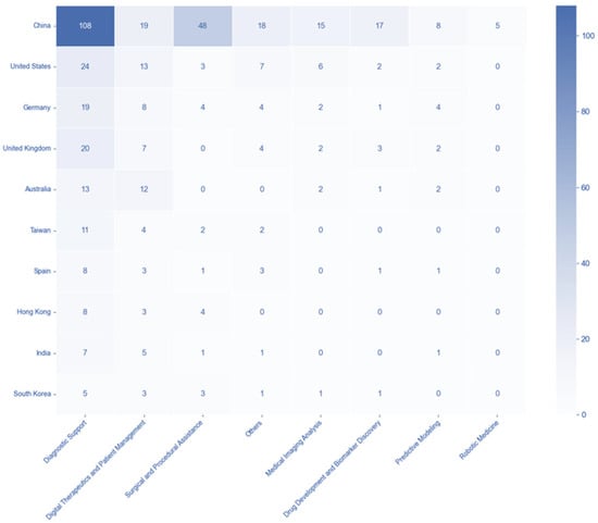 The country-disease association matrix shows the distribution of trials across the top 10 countries and the top 10 disease categories. China exhibited the highest number of trials in Gastroenterology (60 trials) and Oncology (69 trials), also showing significant activity in Cardiovascular Medicine (24 trials). The United States displayed a notable number of trials in Mental Health (10 trials) and Cardiovascular Medicine (10 trials), while Germany showed relatively higher numbers in Gastroenterology (14 trials) (Figure 4). Subsequently, the analysis of the country-technology association matrix reveals the distribution of trials across the top 10 countries and technology categories. China dominated in Diagnostic Support with 108 trials and also showed substantial activity in Surgical and Procedural Assistance (48 trials) and Digital Therapeutics and Patient Management (19 trials). The United States had the second-highest number of trials in Diagnostic Support (24 trials) and Digital Therapeutics and Patient Management (13 trials). Germany and the United Kingdom both showed a notable number of trials in Diagnostic Support, with 19 and 20, respectively. These matrices collectively highlight the varying focus and activity of different countries in AI clinical trials across diverse disease and technology areas (Figure 5).