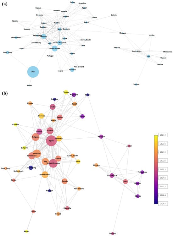 The network visualization reveals distinct regional clustering patterns. European countries (Germany, UK, Spain, Italy, France, Belgium) form a densely interconnected cluster, while Asian countries (China, Hong Kong, South Korea) show limited cross-border connections despite substantial individual research activity. China emerges as the most prominent country with an overwhelming 238 trials, displaying the largest node and signifying its leading position in terms of the sheer volume of AI clinical trial research. Other significant contributors, such as the United States (57 trials), Germany (42 trials), and the United Kingdom (38 trials), also appear as large nodes. However, despite its remarkably high research output, China showed an exceptionally low collaboration rate (1.3%) with only three multicountry participations. This is reflected in its connectivity within this network, appearing relatively focused or less diffuse compared to the more interconnected European and North American clusters, suggesting a predominantly domestically oriented research effort (Figure 6a, Table 2). A crucial observation is the marked reduction in China’s node size in Figure 6b compared to Figure 6a, directly aligning with its low collaboration rate (1.3%) and limited multicountry participation (3 trials) as presented in Table 2. Conversely, countries such as Germany (21.4% collaboration rate, 27 total partners), the United States (10.5% collaboration rate, 18 total partners), Spain (notably high 64.7% collaboration rate with 47 total partners), France (20% collaboration rate, 14 total partners), and the United Kingdom (18.4% collaboration rate, 30 total partners) exhibit notably larger nodes. Regarding the temporal aspect, countries with yellow-hued nodes, such as Turkey, Czechia, Bulgaria, and Macao, signify that their average collaboration years are more recent (closer to 2023–2024). In contrast, countries with bluer nodes, including Romania, Egypt, Luxembourg, and Portugal, indicate earlier average collaboration years (closer to 2020–2021) (Figure 6b, Table 2).