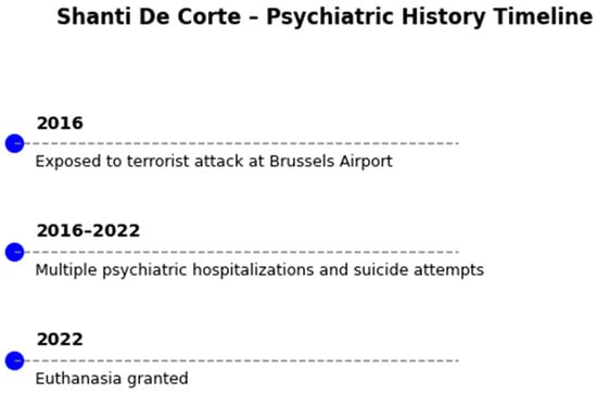 In the first case, euthanasia was granted to a 23-year-old Belgian woman, Shanti De Corte, who had reportedly suffered for years from a depressive disorder following her exposure to a traumatic event—the 2016 terrorist attack at Brussels Airport, during which several of her friends were killed [5]. Her psychological suffering, described in media reports as persistent and unbearable, was ultimately deemed “incurable,” and thus sufficient grounds for approving her request for euthanasia under Belgian law (Figure 1).