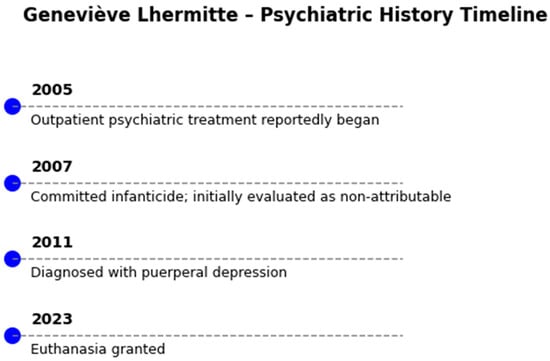 Timeline of key psychiatric events in the case of Geneviève Lhermitte. This Figure outlines major milestones based on publicly available sources, including the onset of outpatient psychiatric treatment in 2005, the infanticide incident in 2007, a diagnosis of puerperal depression in 2011, and the approval of euthanasia in 2023.