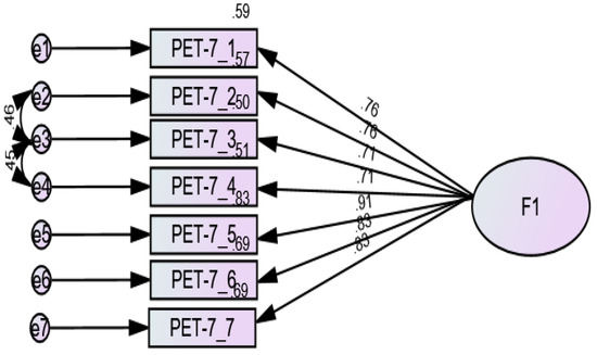 CFA was conducted to evaluate the PET scale’s one-factor structure. Initial analysis revealed moderate model fit statistics (TLI = 0.832; CFI = 0.888; SRMR = 0.054; RMSEA = 0.204, with 90% confidence interval ranging from 0.162 to 0.249). Further examination identified high modification indices (>10), suggesting correlations between items 2–3 and 3–4 (Figure 1). Upon incorporating these correlations, the model showed substantial improvement in fit metrics (TLI = 0.943; CFI = 0.967; SRMR = 0.041; RMSEA = 0.119, 90% CI: 0.068–0.171). Both omega and alpha coefficients (0.93) indicated strong internal consistency.
