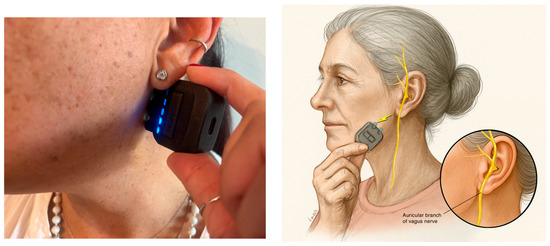 After providing informed consent, she began using a commercially available eVNS device that stimulates the auricular branch of the vagus nerve, producing a mild tingling sensation in the lower ear (Figure 2) [27,28]. The mechanism remains incompletely understood; nevertheless, both neurophysiological and neuromodulatory effects may benefit chronic headaches, and preliminary evidence suggests that eVNS can modulate central pain-processing pathways linked to cervical dysfunction [29]. Because an evidence-based dosage has not been established, she was advised to use the device bilaterally and build up to 10 min of stimulation over four days, applied once on waking and once before sleep, with discretionary daytime use according to the response.