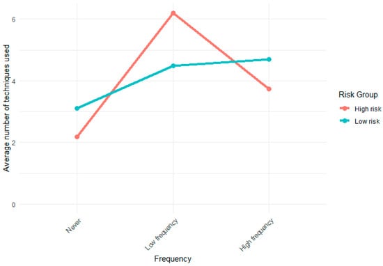 Initial exploration of pattern-based group differences in coping strategy use showed that students in the low-risk group used more exercises at a high frequency (W = 2196.5, p = 0.049), whereas those in the high-risk group used a broader range of exercises at a lower frequency (W = 3664.5, p < 0.001). This pattern—more frequent, selective use among low-risk students versus more varied but inconsistent use among high-risk students—is illustrated in Figure 1.