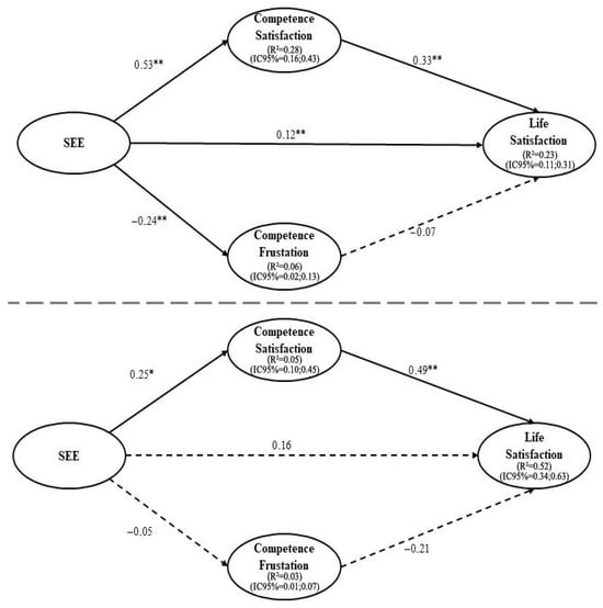 Predictive relationships of the sense of teaching efficacy to Life Satisfaction mediated by competence satisfaction and competence frustration in women (bottom) and men (top). Note: ** p < 0.01; * p < 0.05. SEE = sense of teaching efficacy; R2 = explained variance; CI = confidence interval. The 95% CI is reported in parentheses. The dotted arrows represent the non-significant relationships.