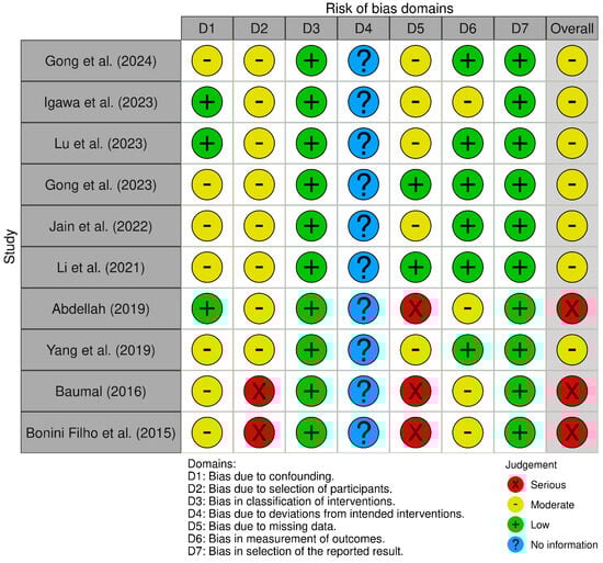 | Study | Overall Risk of Bias | Bias Due to Confounding | Bias in Selection of Participants into the Study | Bias in Classification of Interventions/Exposures | Bias Due to Deviations from Intended Interventions/Exposures | Bias Due to Missing Data | Bias in Measurement of Outcomes | Bias in Selection of the Reported Result |