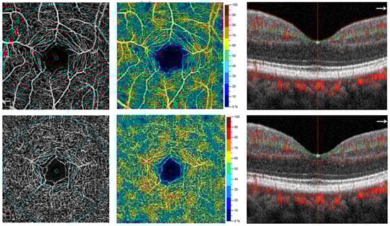 | [15] | Topcon TRITON 3D PLUS Version 10.19 (Topcon, Tokyo, Japan). | Not explicitly stated, likely integrated with the Topcon system. | Showed attenuation of both arteries and veins with significant macular flow void areas. | Showed pruning of both arteries and veins with significant macular flow void areas. |