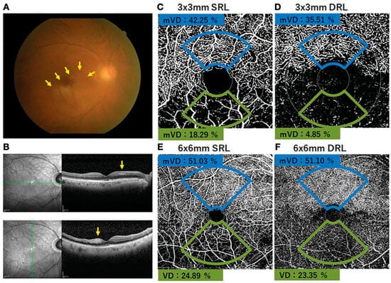 - Igawa, Y.; Amaki, H.; Kanno, J.; Tachibana, M.; Konno, S.; Yoshikawa, Y.; Matsumoto, S.; Shoji, T.; Makita, J.; Shinoda, K. Evaluations of microvascular density by optical coherence tomography, angiography, and function by multifocal electroretinography of the macular area in eyes with branch retinal artery occlusion. Front. Ophthalmol. 2023, 8, 3. [Google Scholar] [CrossRef] [PubMed]