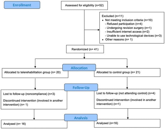 A total of 32 participants were included in this study (Figure 1), with 16 in the telerehabilitation group (TG) and 16 in the control group (CG). The baseline demographic and clinical characteristics were similar between the groups (p > 0.05) (Table 1).