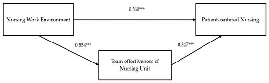 Figure 1. Mediating effect of team effectiveness of the nursing unit on the relationship between nursing work environment and patient-centered nursing. Conceptual model depicting the mediating effect of team effectiveness of nursing unit on the relationship between the nursing work environment and patient-centered nursing. All pathways were statistically significant (*** p < 0.001), and coefficients are based on regression analyses using PROCESS Macro (Model 4) with 5000 bootstrap samples. Control variables included clinical experience, position, and type of hospital.