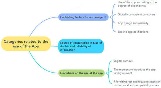 It is also necessary to focus on the limitations that caregivers have had in using the app. Although they believe that it was positive to know about the existence and benefits offered by the app, they did not make excessive use of it because, in these first months, they had many changes in their lives, making it difficult to accommodate other things. In addition, the doubts they had were resolved through other sources that were easier for them to consult. This observation coincides with those described in other studies [50], which describe how most of the changes in caregivers’ lives occur in the first year after the acquisition of the caregiving role.