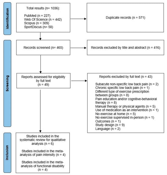 Therefore, the main objective of this study was to analyze the effectiveness of home physical exercise interventions in isolation in reducing pain intensity and functional disability in individuals with NSCLBP. The following were proposed as specific objectives for this same population: (1) to compare the effectiveness between home and supervised in-person physical exercise interventions; (2) to compare the effectiveness between unsupervised and supervised via video home physical exercise interventions; and (3) to compare the effectiveness between home physical exercise interventions and no intervention.