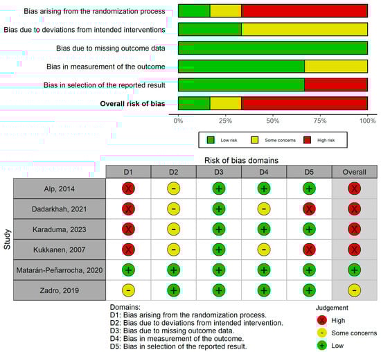 The risk of bias of the included studies measured with the ROB2 tool is summarized in Figure 2. One out of six studies (16.7%) was considered low risk [41], another 16.7% with some concerns [42], and the remaining 66.7% was considered high risk [32,38,39,40].