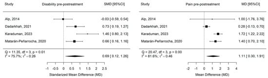 A multivariate meta-analysis (MMA) was applied with the standardized mean difference (SMD) between the pain intensity and functional disability scales using correlations between both types of scales already described in the literature [33,34]. Univariate meta-analyses were also performed for pain intensity and functional disability using the mean difference (MD) as the effect size in pain intensity when all studies used the same scale and the SMD in functional disability when studies used different scales. The models, in both cases, were adjusted using meta-regression, incorporating age and body mass index (BMI) as covariates. These variables were selected due to their consistent availability across most studies and their established influence on exercise outcomes [35,36].