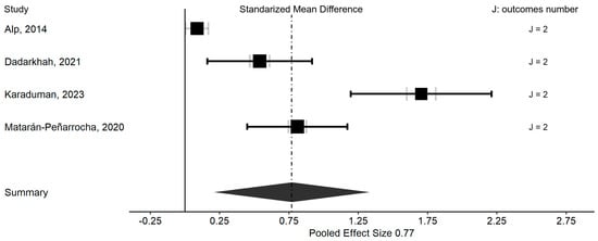 In the MMA, the likelihood ratio test (LRT) and the lowest value in the Akaike information coefficient (AIC) were used to select the fixed or random effects model. In contrast, in the univariate analysis, a random effects model was applied, given the heterogeneity between the studies. Heterogeneity was analyzed by estimating the between-study variance τ2, with Cochran’s Q test as well as with the I2 estimator, defining heterogeneity as not important (<30%), moderate (30–50%), large (50–75%), and important (>75%). The effect size was calculated with Hedges’ G, defining it as small (<0.2), moderate (0.2–0.8), and large (>0.8). Publication bias was analyzed with the Egger’s test. The forest, caterpillar, and funnel plots were created following the recommendations of Fernández-Castilla et al. [37] for multivariate meta-analyses.
