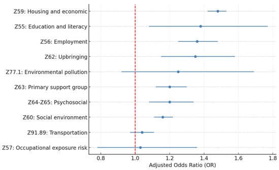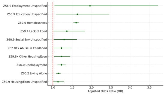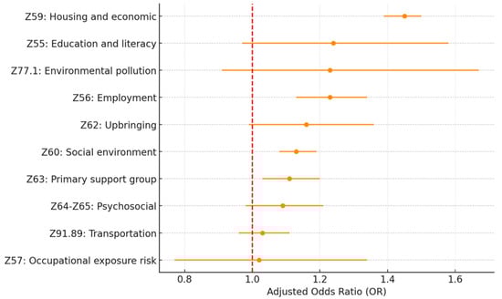 | Z59.8x Other Problems Related to Housing and Economic Circumstances | 680 (0.12%) | 1.22 (1.03, 1.45) | 0.02 |