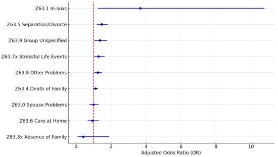 | Z63.1 Problems in Relationship with In-Laws | 14 (0.4%) | 3.67 (1.25, 10.77) | 0.02 |