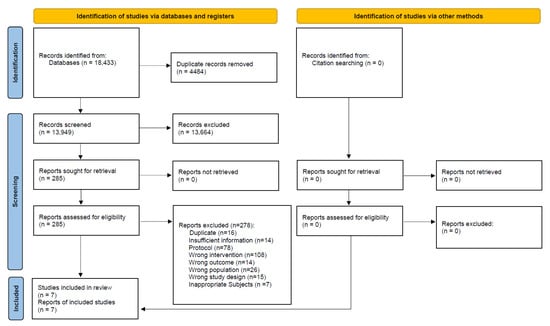A total of 18,433 records were identified from all targeted electronic databases and other resources, excluding 4484 duplicate records. Moreover, 278 reports were excluded during full-text screening: 141 for ineligible population or intervention, 15 for ineligible study design, 78 study protocols, 16 duplicates, 14 for ineligible outcomes, and 14 for insufficient information. Finally, seven studies were included in this review. The study selection process is described in the flow diagram (Figure 1).