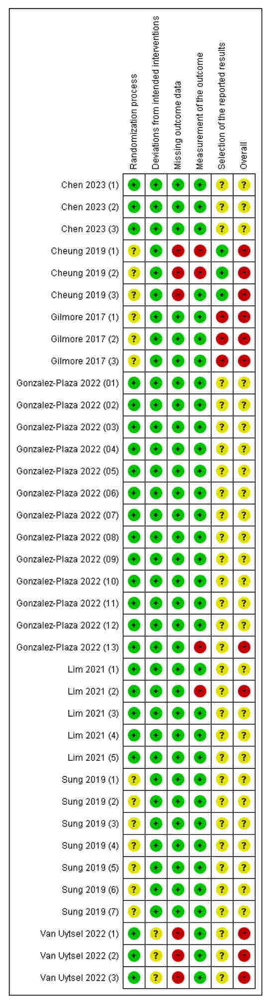 Risk of bias summary [15,36,37,38,39,40,41]. Red with a - symbol: high risk of bias, yellow with a ? symbol: unclear risk of bias, and green with a + symbol: low risk of bias. Chen 2023(1): Gestational weight gain (kg) first trimester, Chen 2023(2): Gestational weight gain (kg) second trimester, Chen 2023(3): Gestational weight gain (kg) third trimester, Cheung 2019(1): Weight change between final evaluation and 10–12 weeks post-partum (kg), Cheung 2019(2): Total weekly activity time (minutes) at final evaluation, Cheung 2019(3): 7-day pedometer step count, Gilmore 2017(1): Change in weight, Gilmore 2017(2): Body fat percentage, Gilmore 2017(3): Waist circumference, Gonzalez-Plaza 2022(1): Unplanned cesarean, Gonzalez-Plaza 2022(2): Gestational weight gain (kg), Gonzalez-Plaza 2022(3): Gestational weight gain–weekly weight gain (kg), Gonzalez-Plaza 2022(4): Composite pregnancy morbidity, Gonzalez-Plaza 2022(5): Miscarriage ≤22 weeks, Gonzalez-Plaza 2022(6): Gestational diabetes, Gonzalez-Plaza 2022(7): Preeclampsia or gestational hypertension, Gonzalez-Plaza 2022(8): Preterm labor ≤37 weeks, Gonzalez-Plaza 2022(9): Birthweight ≤2500 g, Gonzalez-Plaza 2022(10): Perinatal death, Gonzalez-Plaza 2022(11): Early neonatal death, Gonzalez-Plaza 2022(12): Antepartum stillbirth, Gonzalez-Plaza 2022(13): Physical activity (moderate to high), Lim 2021(1): Absolute difference in weight (kg) from first trimester, Lim 2021(2): Waist circumference (cm), Lim 2021(3): Systolic blood pressure (mm Hg), Lim 2021(4): Fasting OGTT test (mmol/L), Lim 2021(5): 2 h OGTT (mmol/L), Sung 2019(1): Cesarean section, Sung 2019(2): Weight gain during study period (kg), Sung 2019(3): Body fat percentage at postpartum, Sung 2019(4): Systolic blood pressure (mm Hg), Sung 2019(5): Fasting glucose, mg/dL, Sung 2019(6): HOMA-IR, Sung 2019(7): Diabetes at 4–12 weeks postpartum, Van Uytsel 2022(1): Weight retention (kg) change after intervention (6 months postpartum), Van Uytsel 2022(2): Body fat percentage change after intervention (6 months postpartum), Van Uytsel 2022(3): Waist circumference (cm) change after intervention (6 months postpartum).