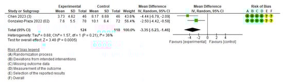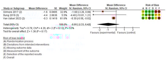 Meta-analysis for the effect of IoT interventions vs. no IoT intervention on fat change (%) of postpartum women [37,39,41]. Red with a - symbol: high risk of bias, yellow with a ? symbol: unclear risk of bias, and green with a + symbol: low risk of bias.