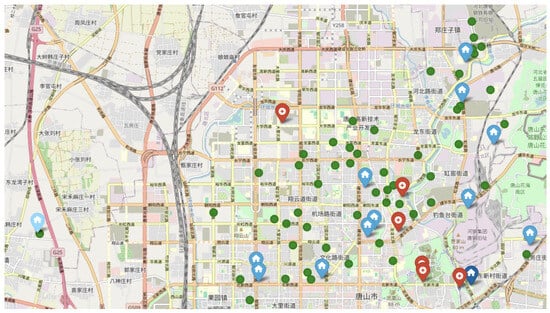 As shown in Figure 1, the district has six tertiary A hospitals (red dots in the figure), namely, Gongren Hospital, Kailuan General Hospital, Tangshan Second Hospital, Affiliated Hospital of North China University of Science and Technology, Tangshan Central Hospital, and Tangshan Traditional Chinese Medicine Hospital. Additionally, there are 56 community hospitals or health service centers (green dots in the figure), indicating relatively abundant medical resources. The residential division centers are indicated by blue dots in the figure, where the division with the highest accessibility has the darkest dot (in the lower-right corner of the figure), and the division with the lowest accessibility is the lightest dot (in the lower-left corner of the figure).