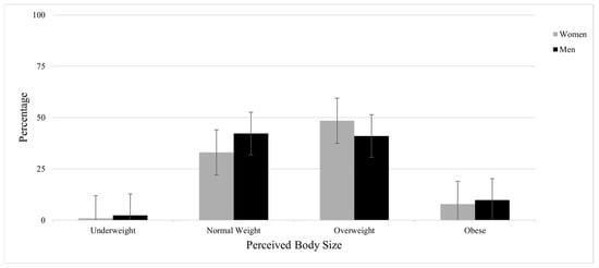 As shown in Figure 1, a small percentage of participants (0.9% women, 2.4% men) selected the underweight body size silhouette as their perceived body size. For normal silhouettes, 33% of women and 42.2% of men selected these as representative of their body size. Nearly half of women (48.4%) and 41% of men selected the overweight silhouette as representative of their body size, while 17.9% of women and 14.4% of men selected the obese silhouettes as representative of their body size. Notably, 7.9% of women and 9.8% of men did not answer this question.