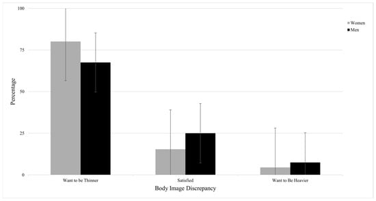 Lastly, as shown in Figure 3, only 15.4% of the women and 25.0% of the men selected ideal body sizes that were aligned with their perceived actual body size. In contrast, a high percentage of participants desired to be thinner (80.1% of the women, 67.5% of men), while a small percentage desired to be heavier (4.5% of women, 7.5% of men). Body size discrepancy could not be calculated for some participants (9.6% women, 13% men) because of missing either their perceived or ideal body size selection, or both.