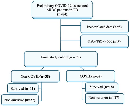 A total of 84 patients who were admitted to the emergency department (ED) with a preliminary diagnosis of COVID-19-associated ARDS were initially evaluated. Of these, 5 patients were excluded due to incomplete data, and 9 were excluded because their PaO2/FiO2 ratio was greater than 300. As a result, 70 patients were included in the final study cohort. Among the included patients, 38 were classified as non-COVID-related ARDS and 32 as COVID-related ARDS. In the non-COVID-19 group, 11 patients survived and 27 did not. In the COVID-19 group, 15 patients survived while 17 did not (Figure 1).