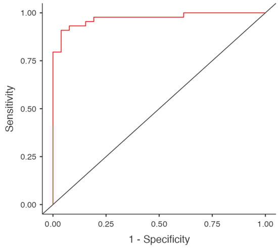 The diagnostic accuracy of the model was assessed using the area under the curve (AUC) of the receiver operating characteristic (ROC) curve, which was calculated as 0.972. The sensitivity and specificity were 84.6% and 95.5%, respectively. The model’s accuracy was 91%, indicating good predictive power (Figure 2).