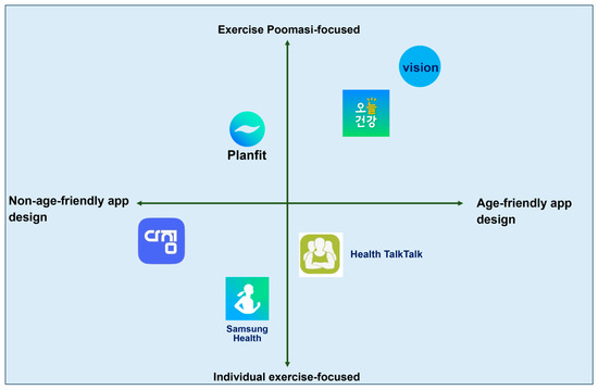 Competitive positioning of healthcare applications. The vertical axis represents the focus on “Exercise Poomasi” versus individual exercise, while the horizontal axis contrasts non-age-friendly and age-friendly app designs. Applications plotted include Planfit, Samsung Health, Health TalkTalk, Vision, and two Korean healthcare apps (Dazim [다짐] and Oneul Geongang [오늘 건강]), which are widely used in South Korea to support fitness and wellness management.