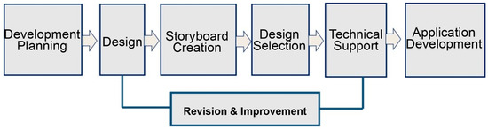 To further clarify the development trajectory, Figure 2 illustrates the iterative design pipeline of Movement Poomasi “Wello!”. The diagram depicts sequential phases—development planning, design, storyboard creation, design selection, technical support, and application development—while the “Revision & Improvement” loop highlights feedback cycles generated by expert review and usability testing. This contextual explanation emphasizes that Movement Poomasi was not created as a linear product but as a continuously refined ecosystem, directly integrating user and expert insights into successive development stages.