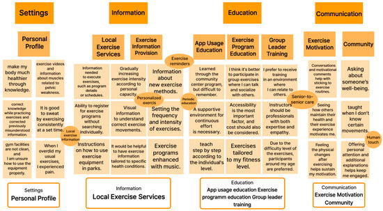 Specifically, Table 4 consolidates open-ended suggestions from participants, which were categorized into three thematic domains: (1) information, emphasizing the need for exercise guidance tailored to seniors’ physical conditions and transparent reporting of results; (2) education, reflecting strong demand for tutorials, trainer guidelines, and digital literacy training; and (3) social interaction, underscoring the importance of small-group activities, companion participation, and achievement sharing. These insights directly informed the functional expansion of Movement Poomasi, particularly its educational modules, peer-sharing mechanisms, and motivational feedback system. Furthermore, the expressed need for optional features such as location and health status sharing illustrates users’ interest in community-based safety and accountability measures, providing a roadmap for future iterations of the application.