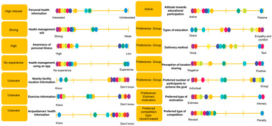 Implications and behavioral variables from interview results. Implications and behavioral variables from interview results. Colored circles represent individual respondents for visual distinction only and do not correspond to additional variables.