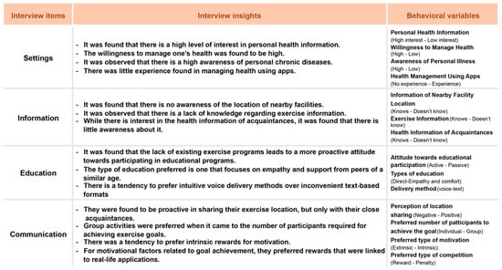 Interview results: Behavioral variables and behavior pattern mapping tasks.