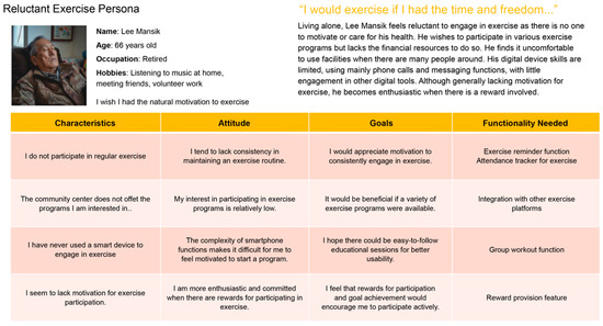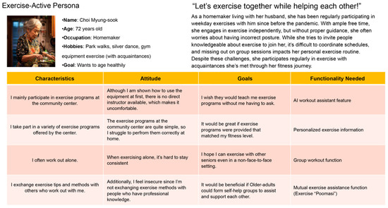 Using persona modeling (Figure 4), two primary user types were identified: movement-active seniors, who are socially motivated and digitally proficient, and reluctant participants, who require simplified interfaces and external encouragement. Behavioral mapping (Figure 5) informed the app’s system refinements, including onboarding tutorials, AI-driven movement suggestions, and interface simplification. This ensured usability for users across the digital literacy spectrum.