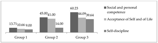 Regarding the psychometric properties of the instrument, these are adequate both in the original adaptation and in the Spanish version [31,32,33], showing reliabilities of 89% and 93%, respectively. The total variance explained by the latter version was 82.60% (35.40% for Acceptance of Self and Life, 23.40% for Social Competence, and 22.8% for Self-Discipline). In relation to the present study, adequate internal consistency was obtained through Cronbach’s alpha coefficient (α = 0.87).