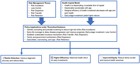 This study adopts an integrated analytical framework that combines risk management theory with Grossman’s health capital model. Together, the two form a dual theoretical perspective for identifying the shortcomings of current rare disease coverage and designing targeted reform strategies. Although each theoretical framework provides different insights, they also overlap and merge in practice. A typical example of this convergence is early intervention. In risk management theory, early intervention embodies the core function of loss control—reducing the frequency or severity of potential losses through preventive measures. Simultaneously, it aligns with the logic of health capital accumulation: investing in health at the earliest stages of life yields greater returns in terms of clinical outcomes, quality of life, and long-term cost-effectiveness.