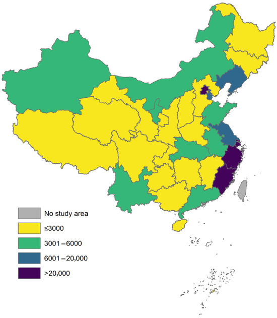Distribution of annual reimbursement caps for outpatient services under urban and rural resident basic medical insurance (URRBMI) in 31 provincial-level administrative centers. Note: The reimbursement caps shown in the map are represented in CNY.