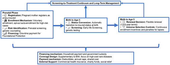 Evidence from multiple stakeholders further substantiates this necessity. At the national level, interviews with patient organizations indicate that 82.1% of respondents recommend establishing a dedicated rare disease insurance scheme to cover expenses not reimbursed by basic medical insurance [51]. Surveys of physicians and interviews with experts likewise identify such dedicated insurance as the most promising approach to addressing the high costs of orphan drugs, while stressing the critical importance of early screening and diagnosis for improving treatment outcomes [52]. At the local government level, regions such as Gansu, Beijing, Foshan, and Qingdao, among others, have explored diversified rare disease protection arrangements to subsidize high-cost treatments not included in the national reimbursement list, reflecting a proactive fiscal and policy commitment to rare disease protection [35,41]. This dual foundation of theoretical and practical evidence not only underscores the necessity of an innovative institutional design but also provides a robust empirical and conceptual basis for the proposed Dedicated Insurance Scheme for Rare Diseases (DISRD).