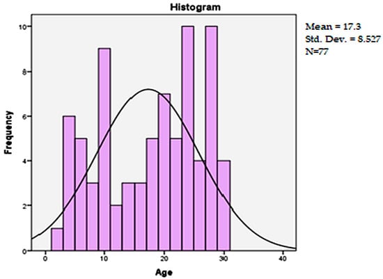 Out of the 77 patients, the majority were male (66.2%, n = 51), with a male-to-female ratio of 2:1. Figure 2 shows the distribution of patient ages. The average age was 17.3 years (±8.52), with notable peaks around 10 and 25 years. Most injuries (74%) were caused by road traffic accidents, encompassing drivers, passengers, and pedestrians. Additionally, 13% of injuries resulted from falls, while 11.7% were attributed to mechanisms such as crushing or physical aggression.