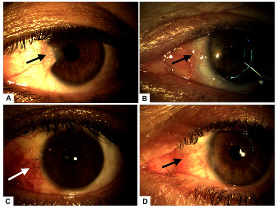 (A) Preoperative image showing a Grade 3 nasal pterygium (arrow) in the left eye with mild visual axis involvement. (B) Postoperative complication on day 3: graft displacement with complete scleral exposure (arrow), indicative of early-stage scleromalacia. (C) Conjunctival surface showing significant recovery and granulation tissue formation (arrow) after 14 days of intensive treatment with autologous serum and PRGF eye drops. (D) Complete conjunctival surface restoration (arrow), observed 30 days after initial surgery, following successful placement of a superior conjunctival graft.