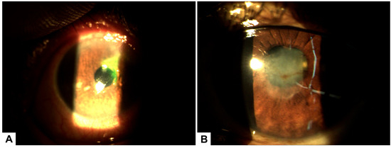 (A) Biomicroscopy of the left eye showing a superior corneal ulcer with stromal involvement and associated peripheral pannus prior to initiating treatment with PRGF. (B) Biomicroscopy image after 30 days of PRGF therapy, demonstrating complete epithelial healing with residual corneal leucoma and evidence of stromal remodeling.